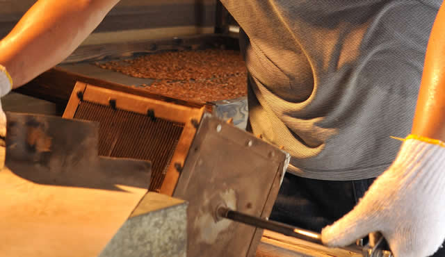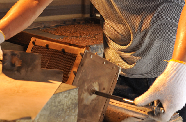 七輪に備長炭を入れ、その上に焙煎カゴを設置。回転させていくと、中の豆は焼け、こんがり良い色に変わっていきます。しかし良いのは、色だけ。温度管理も何もしていないため、外側が焦げただけで、豆の芯は焼けてない。もちろん、美味しくない・・・。回転時間の問題かもしれないと、長い間回転させ続けてみると、熱しすぎて豆が燃える!という散々な結果に。炎に包まれる豆。心が折れそうになることもありました。